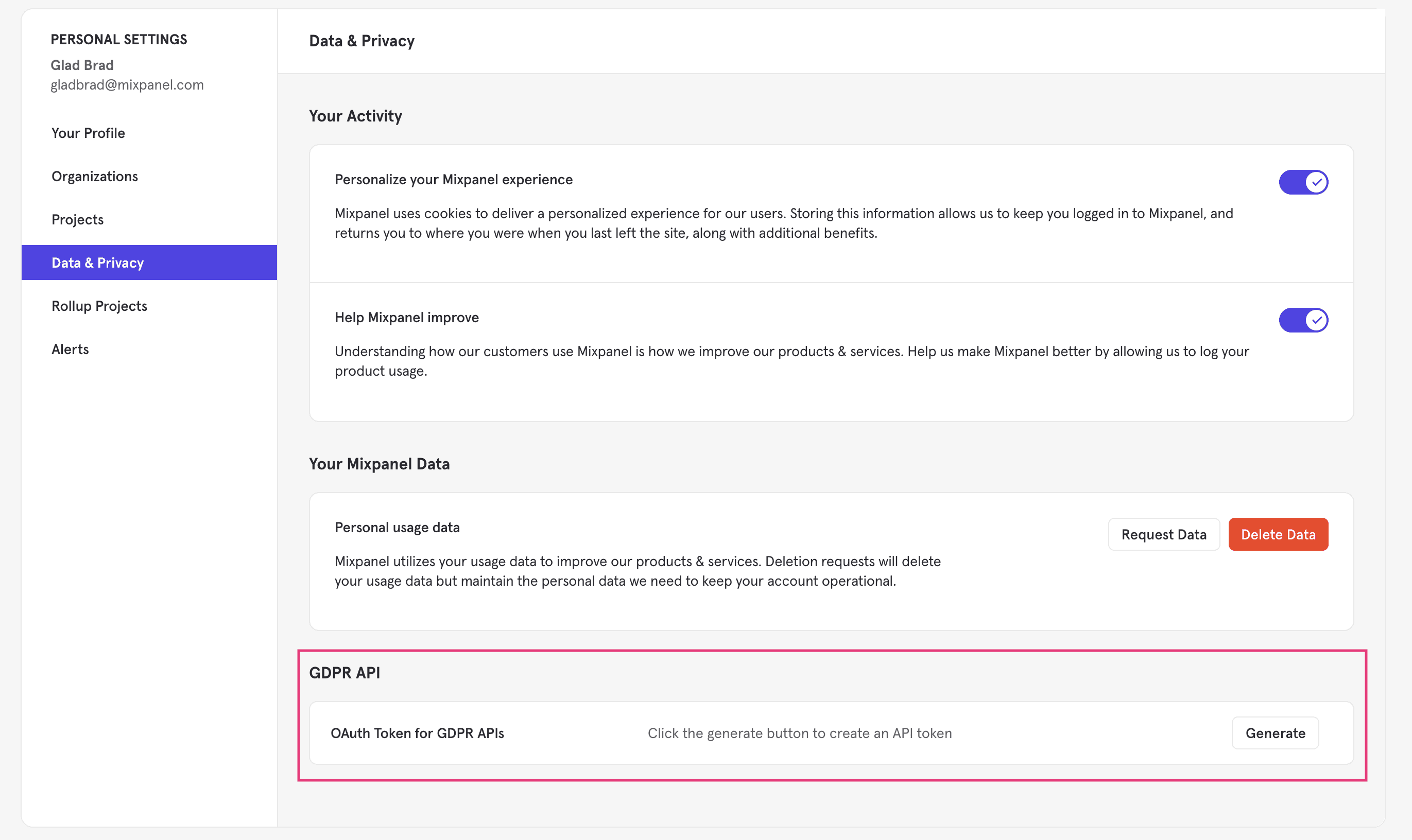 Authentication occurs via a user-specific OAuth token with a scope that only includes the following deletion and retrieval APIs. Users can retrieve this token from their Account Settings by selecting their initials in the top right of Mixpanel and selecting Profile & Preferences, and then the Data & Privacy tab. The OAuth token has a one-year expiry. It should be passed in the Authentication header. Users are eligible to generate an OAuth token if they are the project owner, or if they are a project owner or admin of a project that supports team member roles.